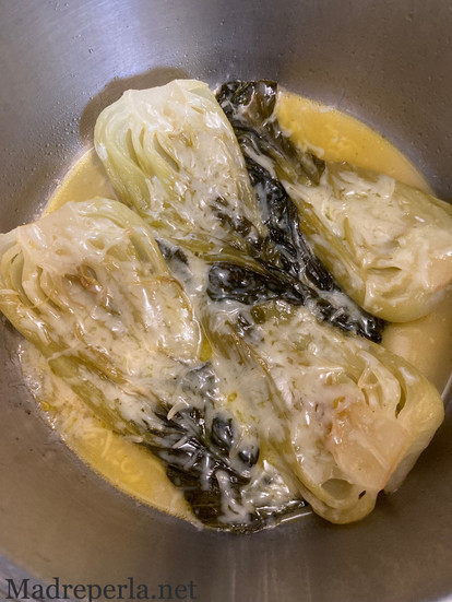 Retourner les pakchoi, les couvrir de fromage, remettre le couvercle et cuire 5 minutes de plus.