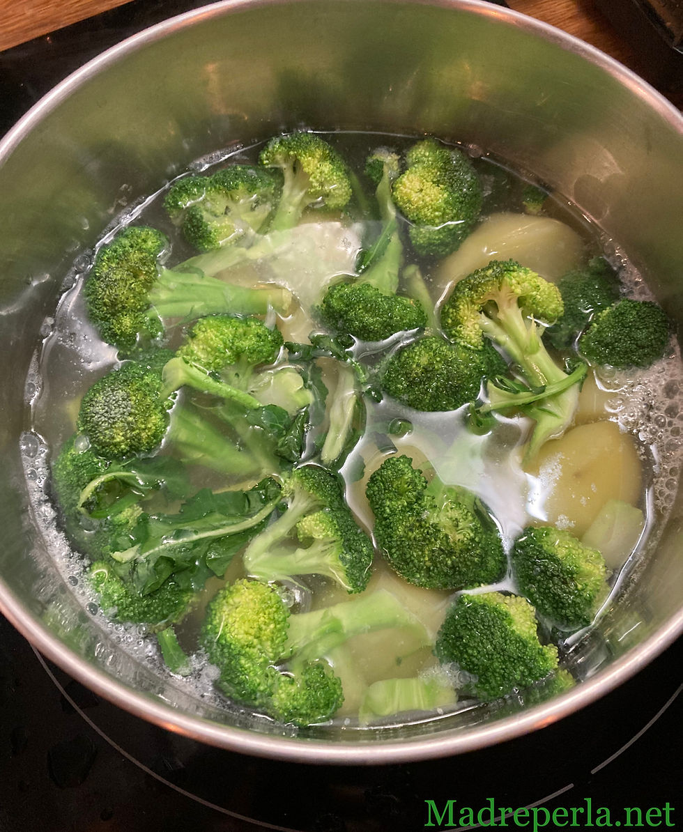 Commencer à cuire les pommes de terre dans l’eau froide, avec les 2 gousses d’ail épluchées et coupées. Quand l’eau bout, compter 15 minutes de cuisson, ajouter le brocoli, cuire 20 minutes de plus.