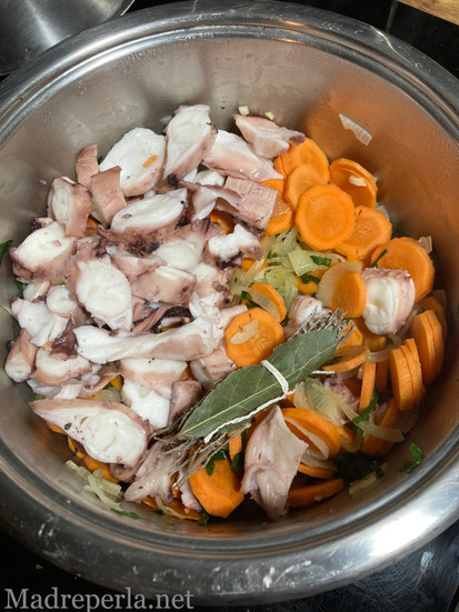 Pour 4 personne: 1 kg de tentacules de poulpe (déjà préparées et nettoyées), 4 carottes, 1/2 branche de céleri (plutôt les feuilles), 1 boîte de 400g de tomates en morceaux, 1 oignon, 3 gousses d’ail, 1 bouquet garni, 1/2 litre de vin rouge, 1 c.à soupe de cannelle en poudre, sel, poivre.