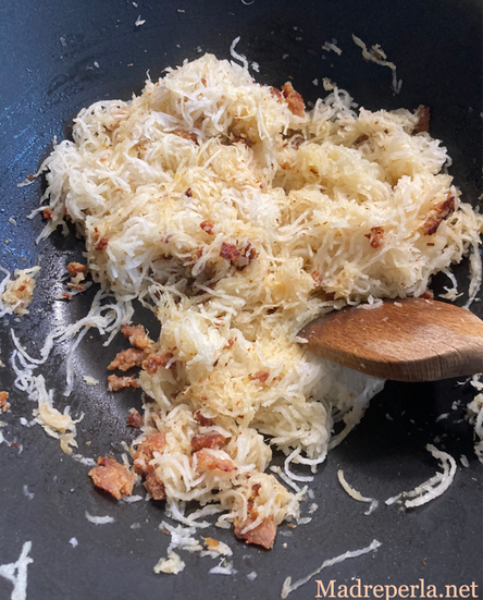 Éplucher la saucisse, l’émietter en petits morceaux et la faire revenir dans un wok avec un peu d’huile. Ajouter le radis râpé, faire revenir en remuant l’ensemble. Au bout de 5 minutes, ajouter 44cl d’eau, la sauce de soja et la sauce de poisson et cuire 10 minutes de plus. Ajouter la pâte, bien remuer.