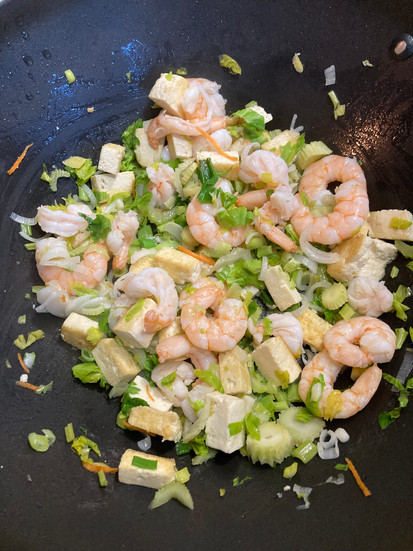 Faire revenir avec un peu d’huile dans un wok le tofu, les crevettes, ces oignons nouveaux et le céleri.