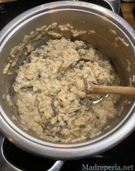 Faire revenir dans un peu d’huile d’olive les échalotes, puis ajouter les champignons, cuire 10 minutes. Ajouter le riz, le faire légèrement braiser (on dit « chanter » en italien), ajouter louche après louche le bouillon, sans cesser de remuer, jusqu’à ce que le riz soit cuit et avoir la bonne consistance (perso, je le préfère un pet crémeux).